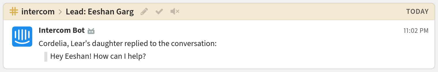 Create a bot for Intercom. Make sure that you select Incoming webhook as the Bot type.